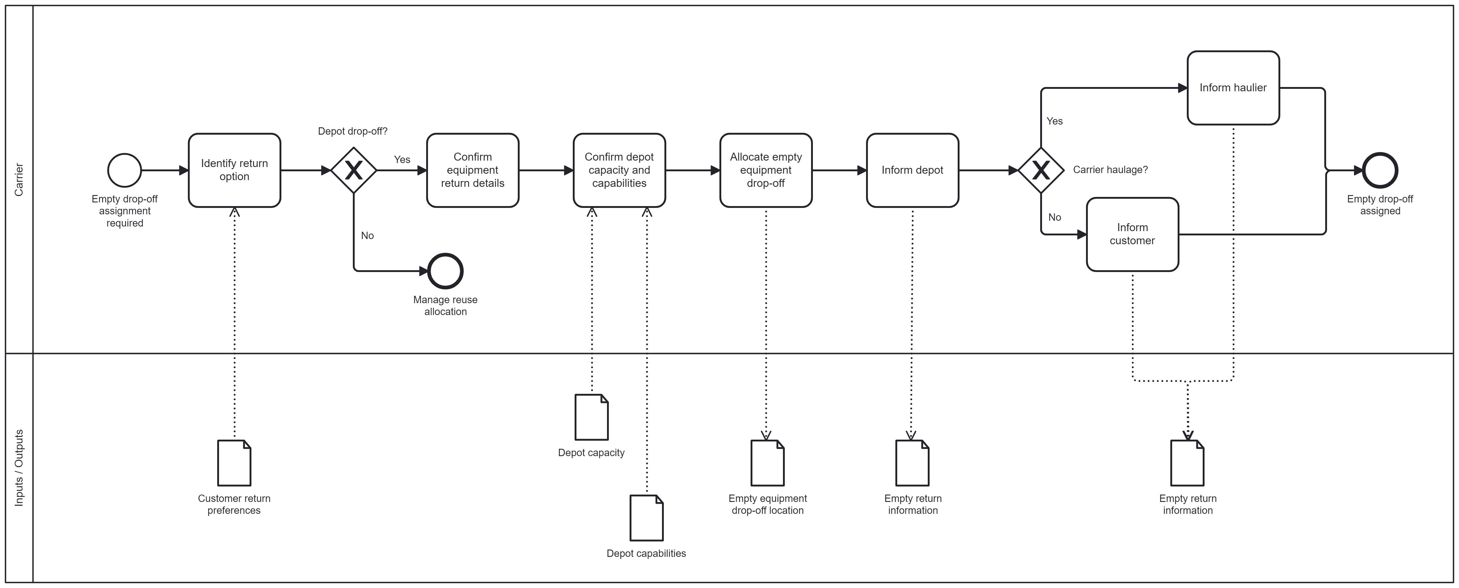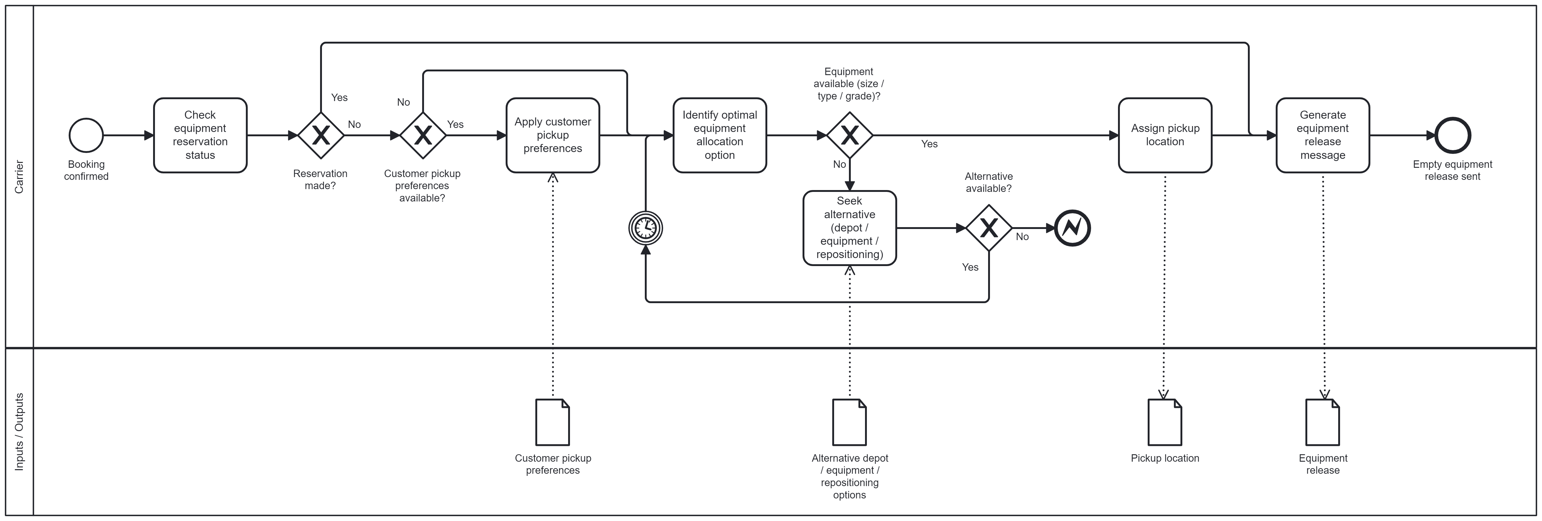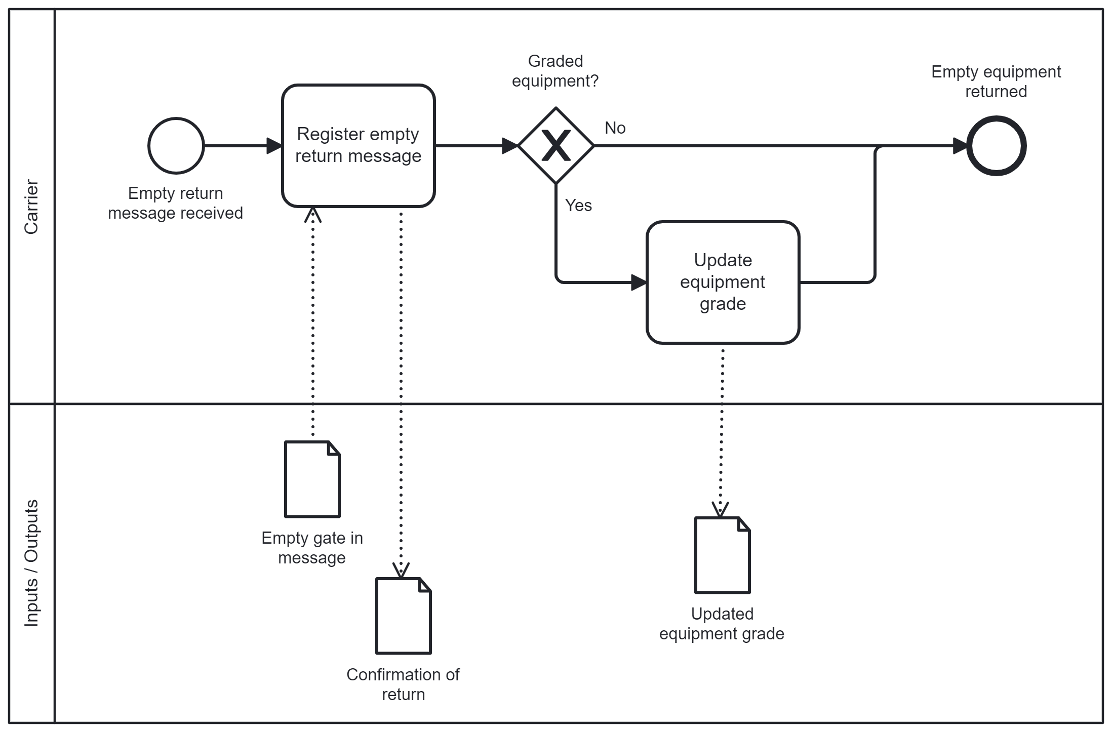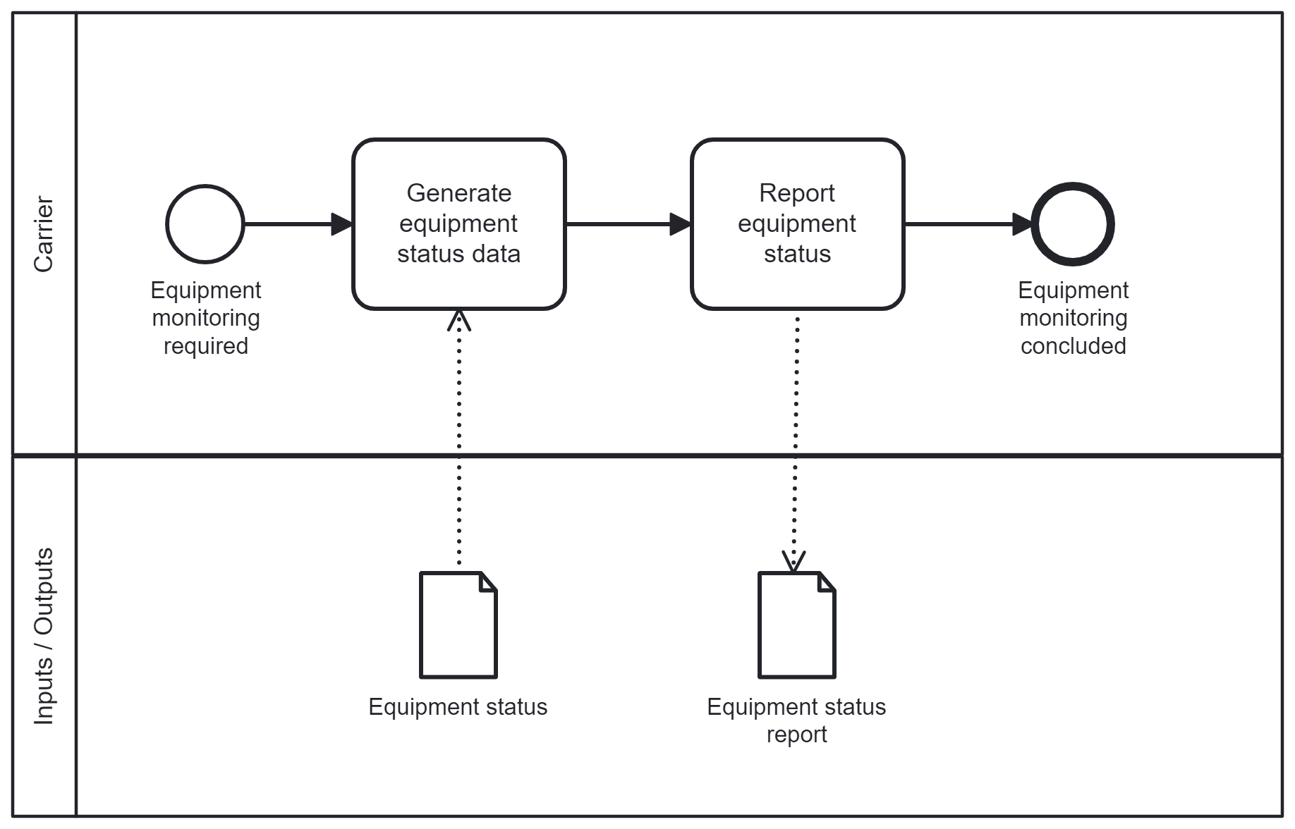 The BPMN diagrams below provide a detailed view of the equipment-related processes, illustrating how container movements and status information are planned, executed, and exchanged between carriers, depots, terminals, and other operational partners, in alignment with relevant DCSA standards.