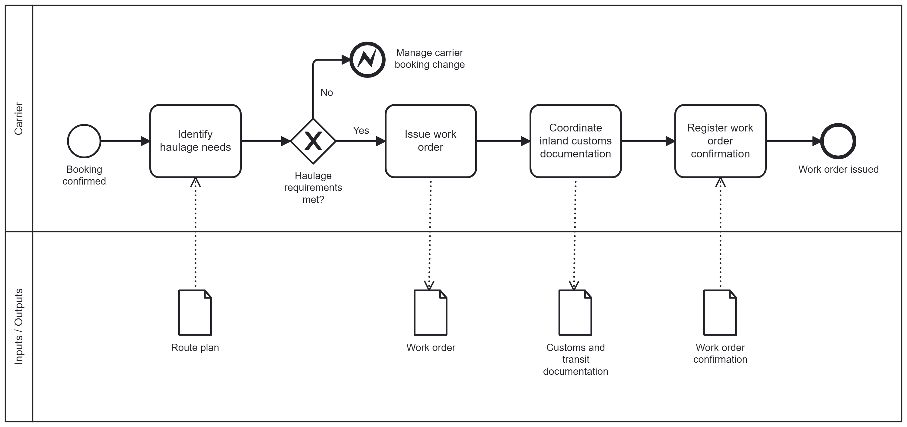 This process covers the identification of carrier haulage requirements and the creation and issuance of a work order to the haulage provider based on the booking and route plan. It includes the coordination of inland customs documentation and the registration of the work order confirmation received from the haulage provider.