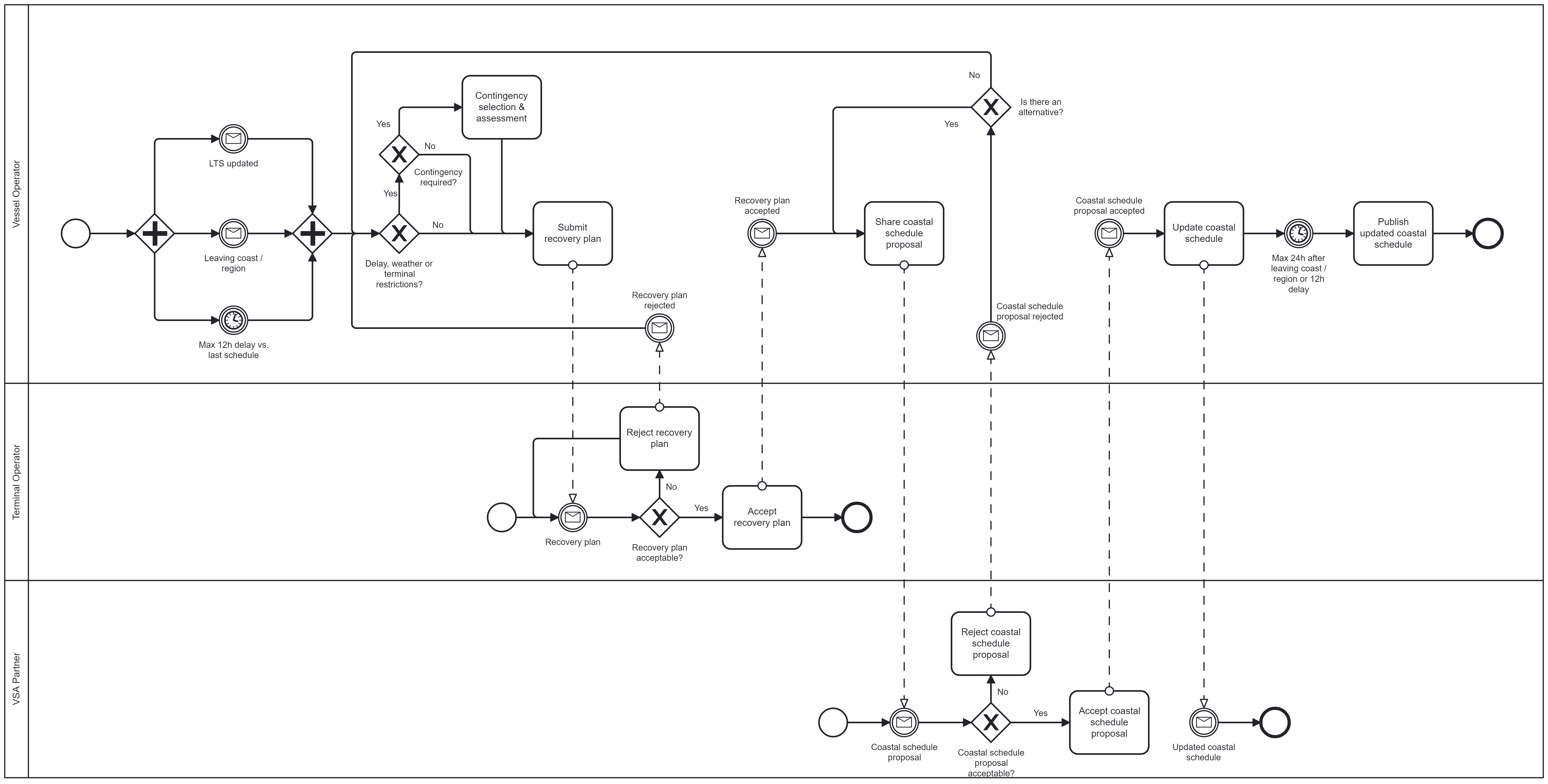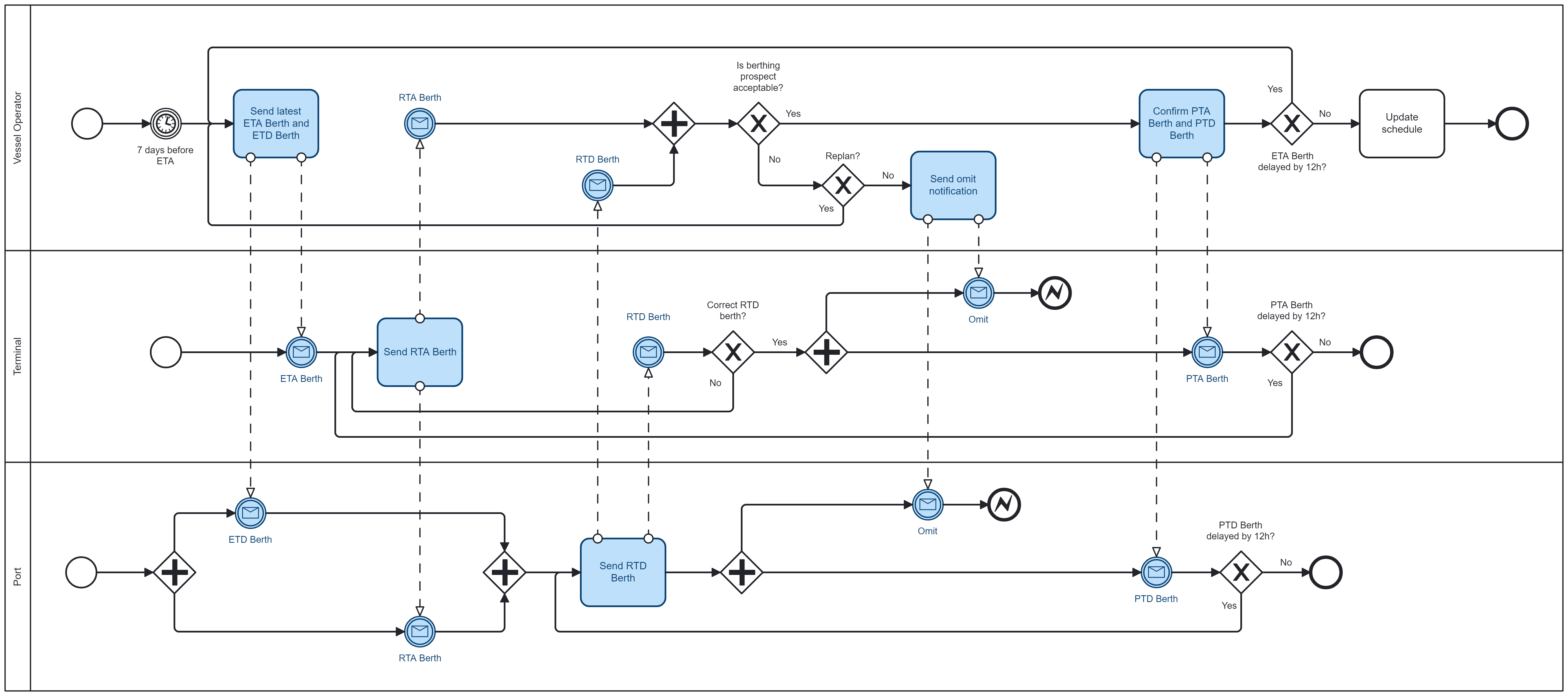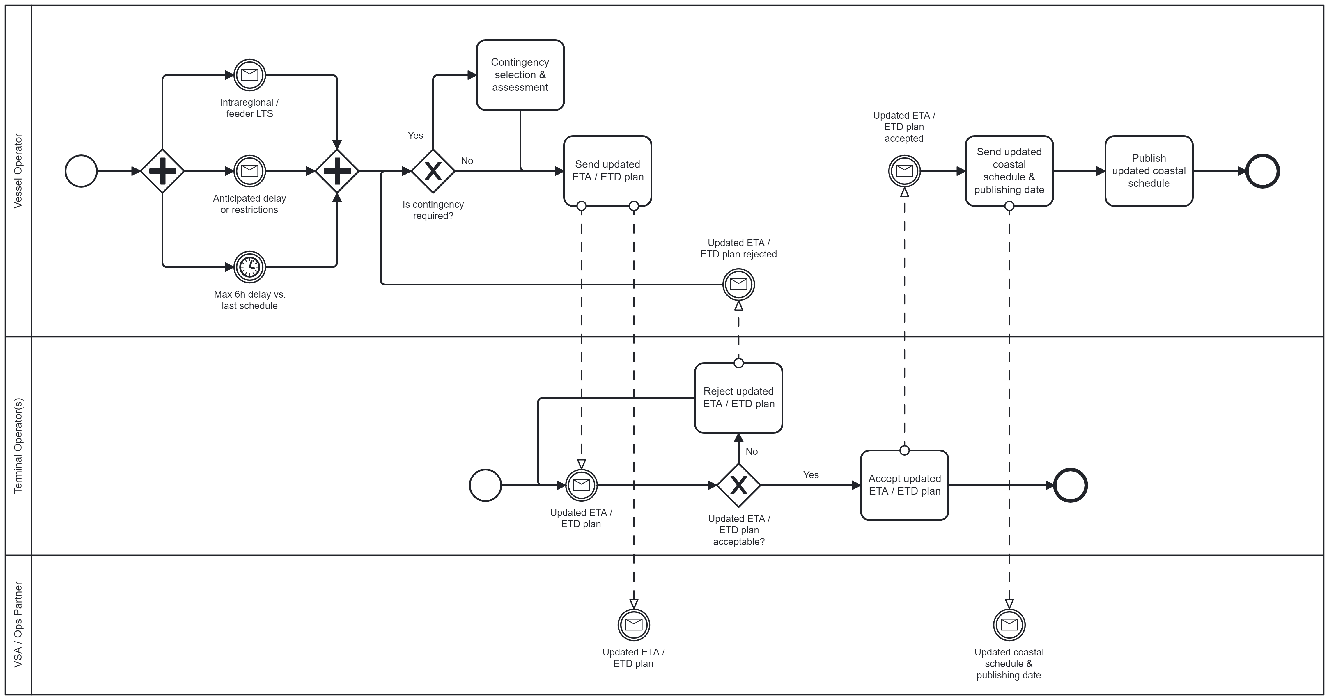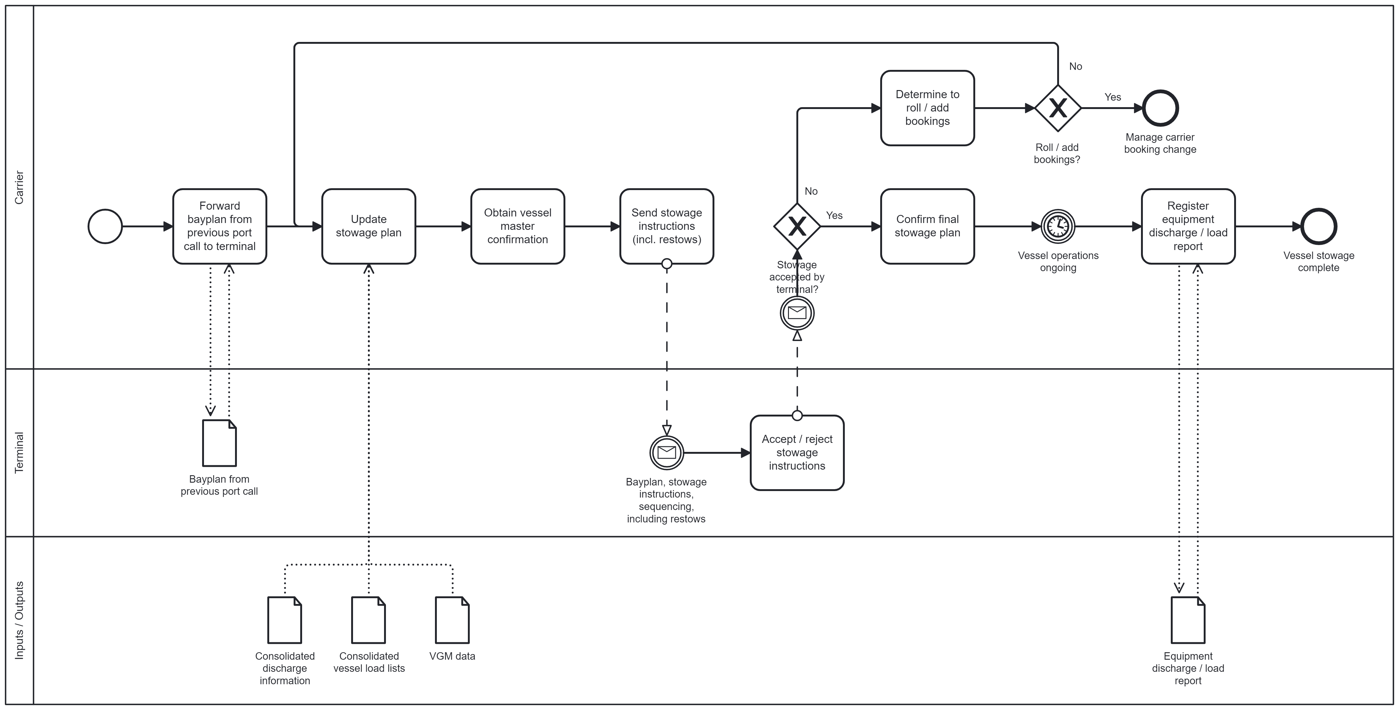 The BPMN diagrams below provide a detailed view of vessel-centric processes, highlighting how carriers, terminals, ports, and service providers collaborate to plan, execute, and reconcile vessel operations in accordance with DCSA standards.
