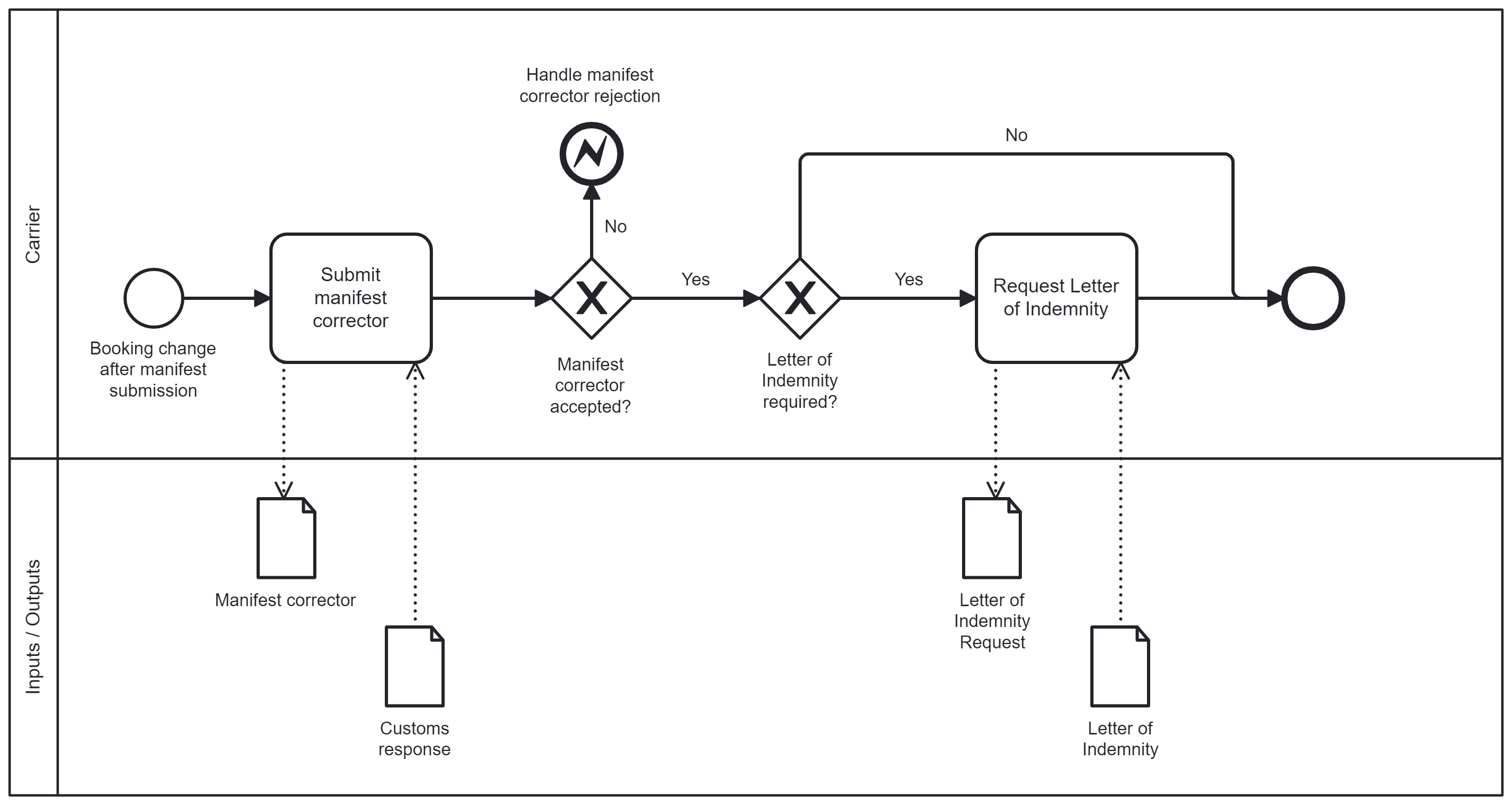 This process covers the submission of a manifest corrector following a booking change after customs manifest submission. It includes submission of the manifest corrector to the relevant authority, handling of acceptance or rejection outcomes, and, where required, the request and processing of a Letter of Indemnity.