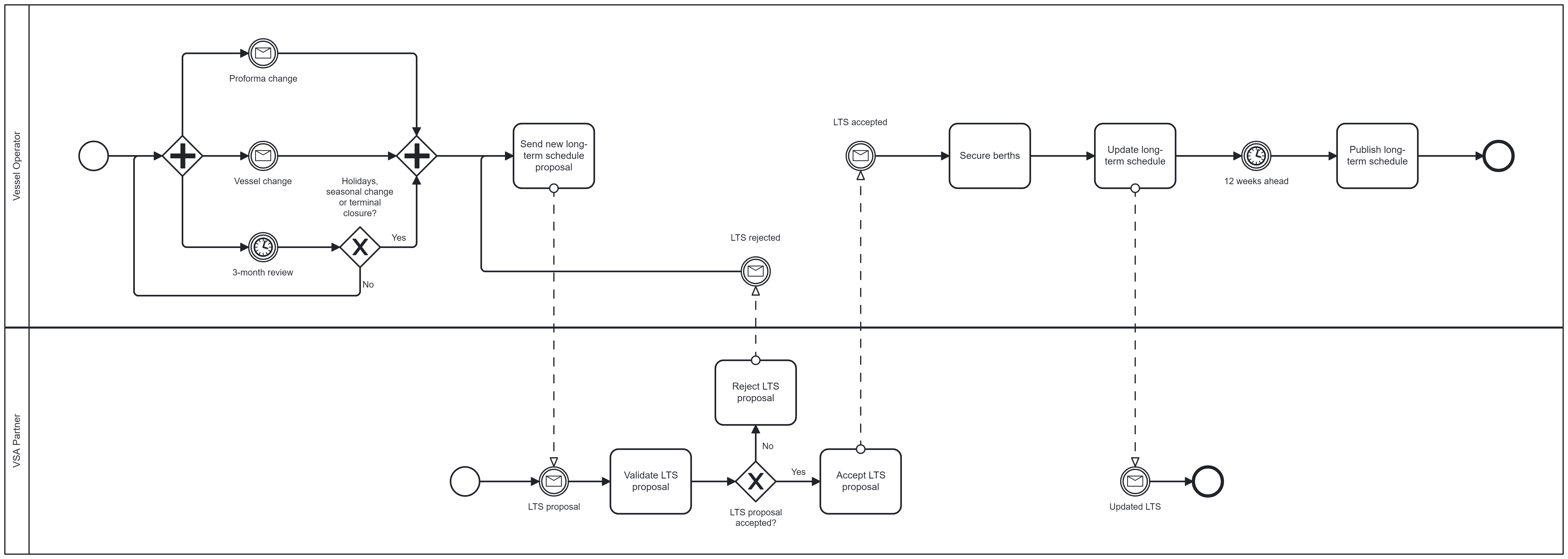 This process covers the preparation, validation, and publication of the long-term vessel schedule. It includes the identification of schedule changes, submission of long-term schedule proposals, validation and acceptance by the relevant partners, securing of berths, and publication of the updated schedule at least 12 weeks ahead of voyage commencement.