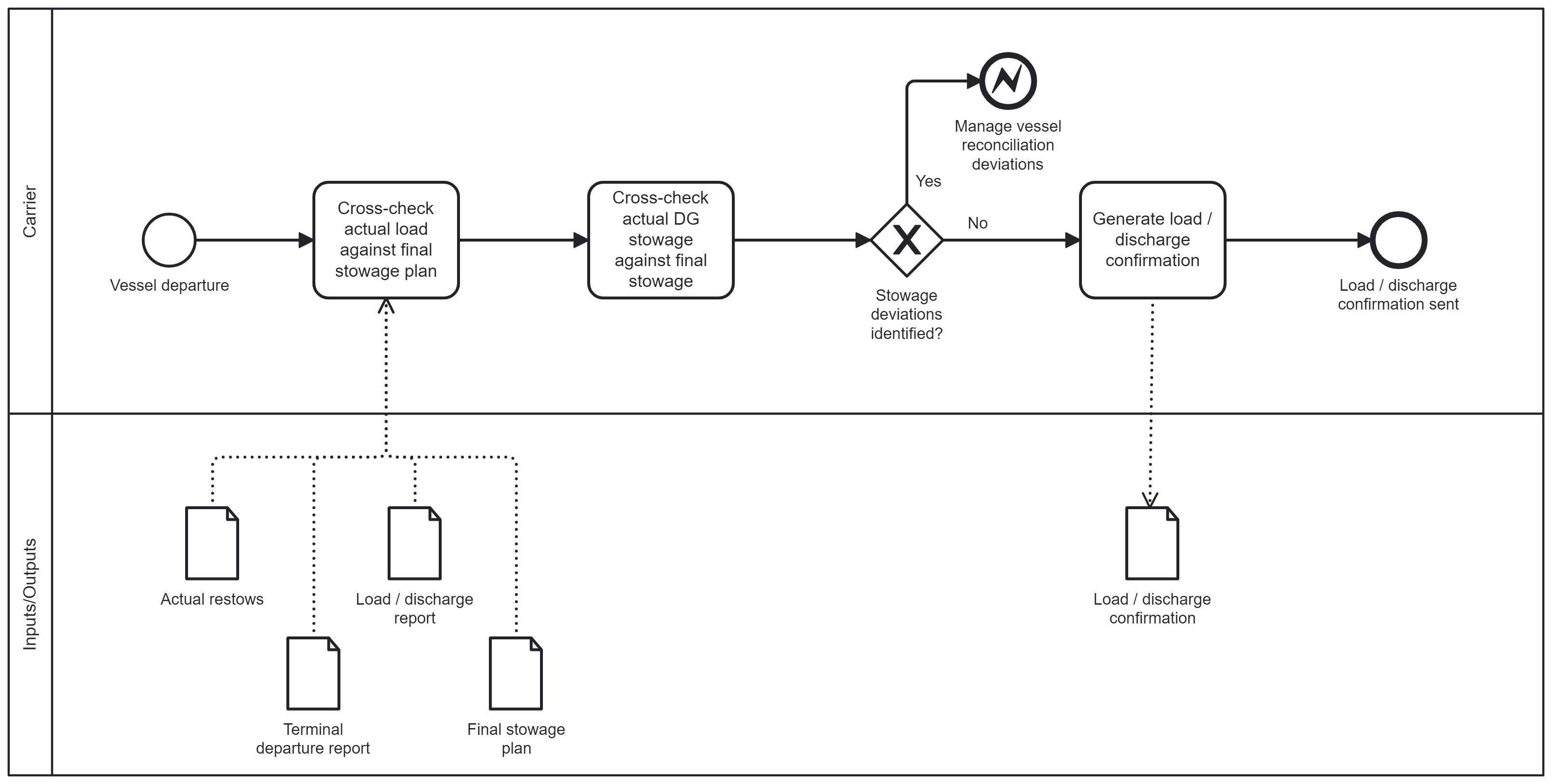 This process covers the reconciliation activities performed following vessel departure in preparation for arrival at the next port. It includes cross-checking actual load and dangerous goods stowage against the final stowage plan, identification and management of any stowage deviations, and generation of load and discharge confirmation.