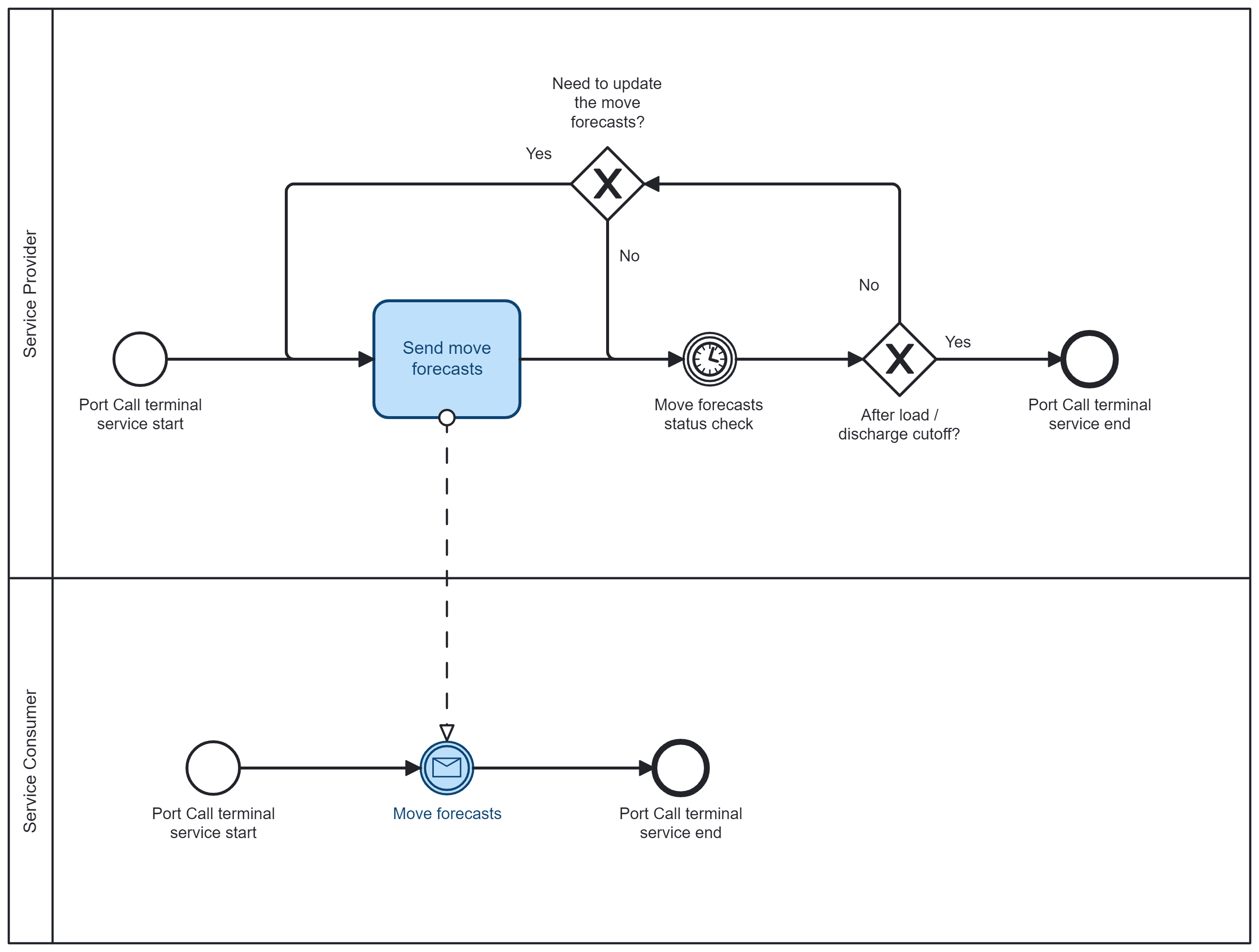 Move forecasts are exchanged to support the planning and execution of terminal operations throughout the port call window. This process does not cover the exchange of official or binding operational information with final moves to be performed.