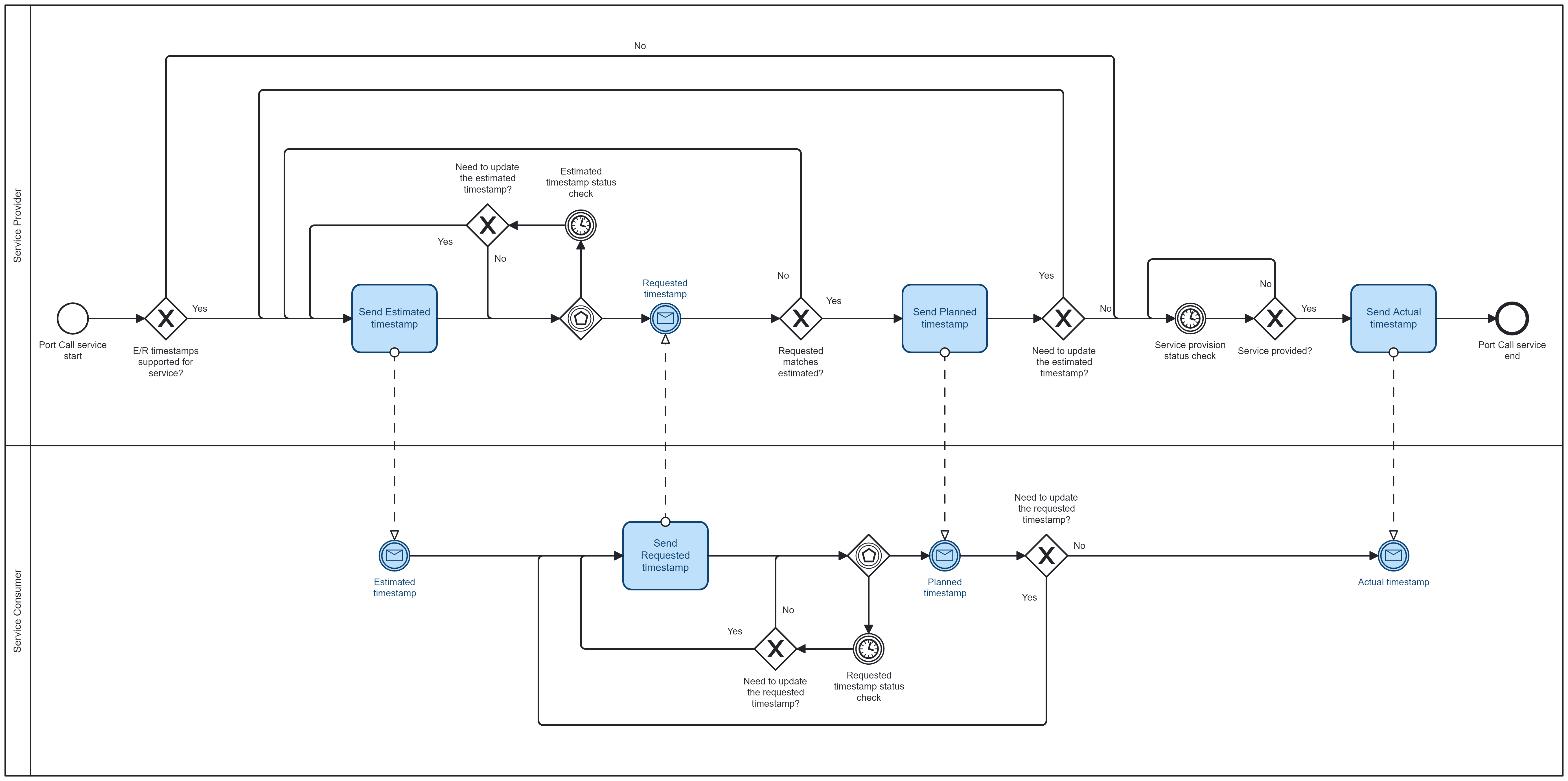This process covers the exchange and update of port call timestamps between service providers and service consumers in accordance with the DCSA Port Call standard. It includes the provision of estimated, planned, and actual timestamps, handling of timestamp requests, validation of timestamp updates, and periodic status checks throughout the port call lifecycle.