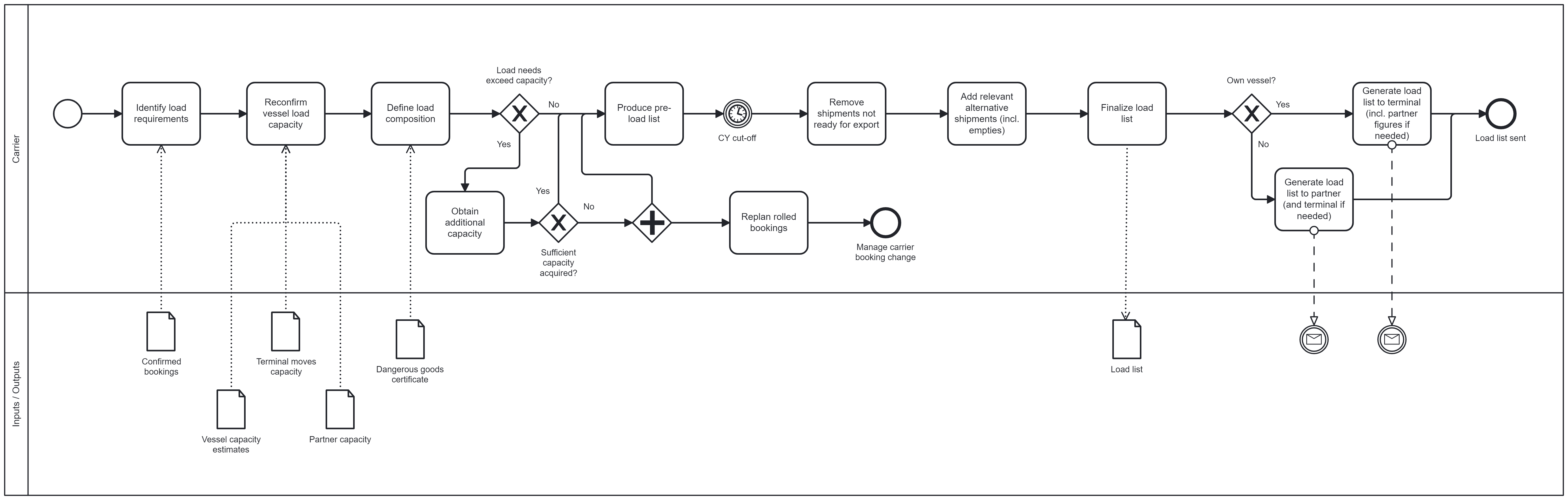 This process covers the preparation and finalization of the load list for a specific vessel and port call. It includes identification of load requirements, confirmation of vessel and terminal capacity, definition of load composition, resolution of capacity constraints where required, and finalization of the load list.