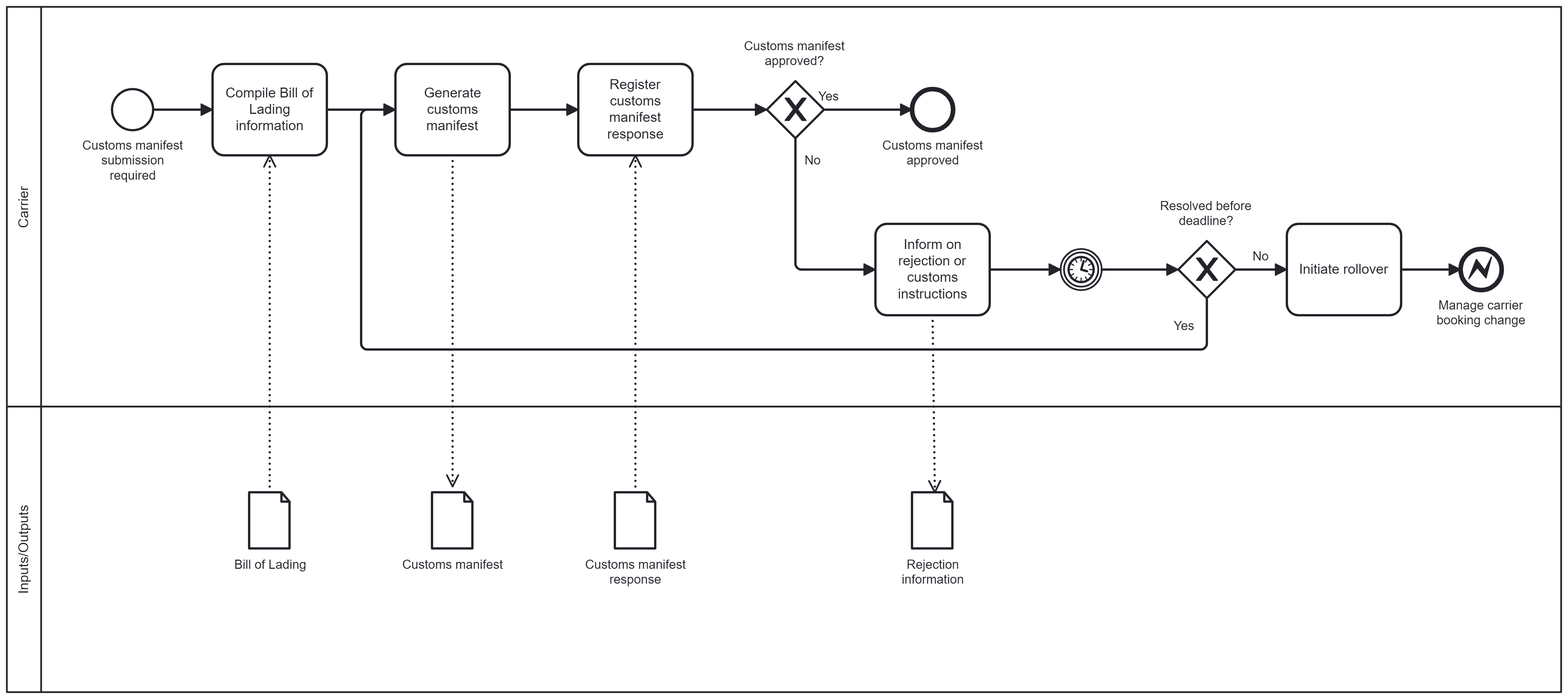 This process covers the compilation of Bill of Lading information, the generation and submission of the customs manifest to the relevant authorities, and the registration of the customs response. It includes handling of approval or rejection outcomes and, where required, communication of corrective instructions or initiation of follow-up actions.