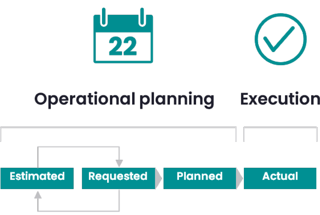 The planning and execution of many events follow the same pattern, in which several instances of the estimated, requested, and planned times can occur.