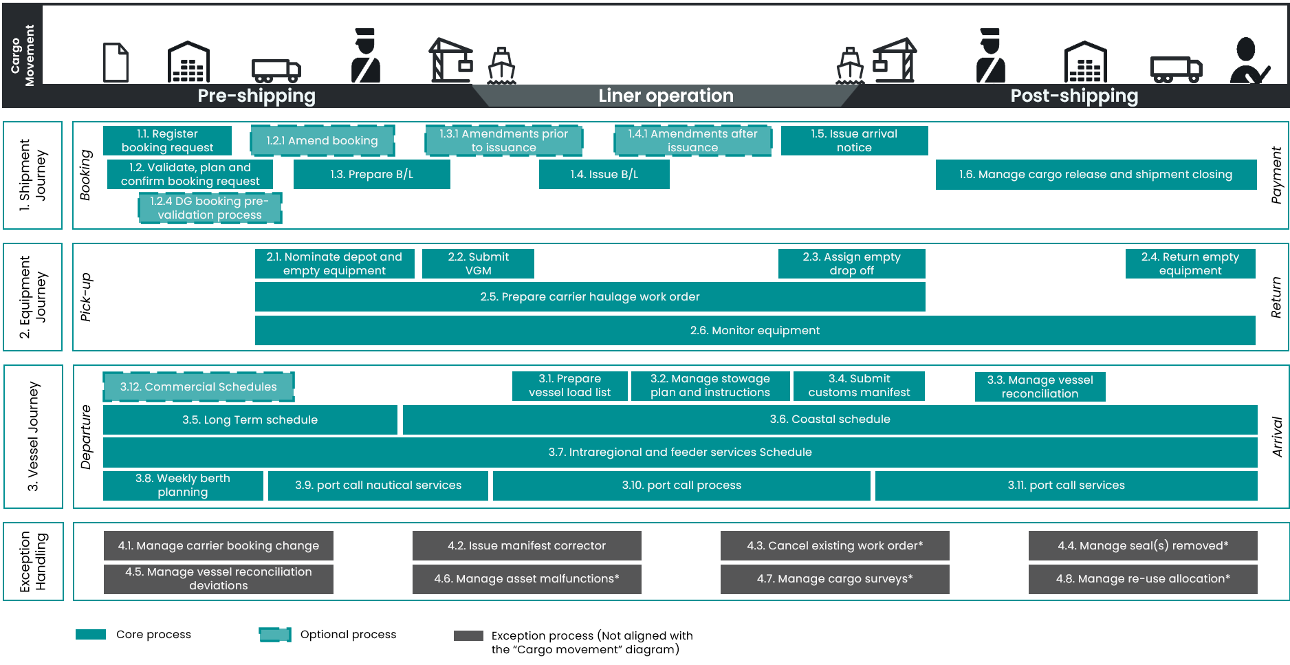 The operational vessel schedules and communications regarding cargo operations are running as separate processes in parallel. These processes are included in the DCSA Industry Blueprint and not addressed in this document.