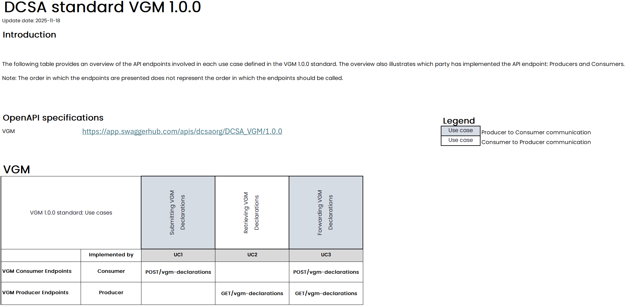 The endpoint overview provides a clear mapping between the defined VGM use cases and the corresponding API endpoints outlined in the API specification. Its purpose is to ensure a shared understanding of how each use case is supported by the API.