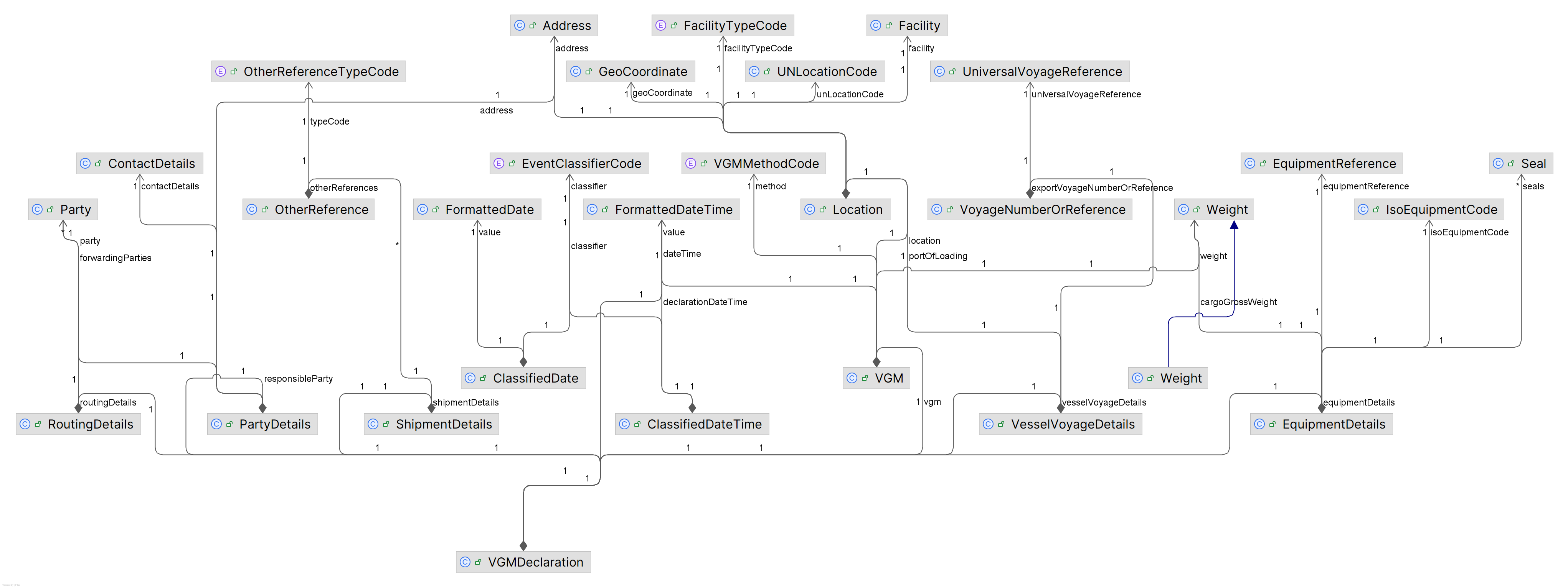 Exported diagrams of the relevant subset of the DCSA Java information model as of the release of the VGM standard are available in this section.
